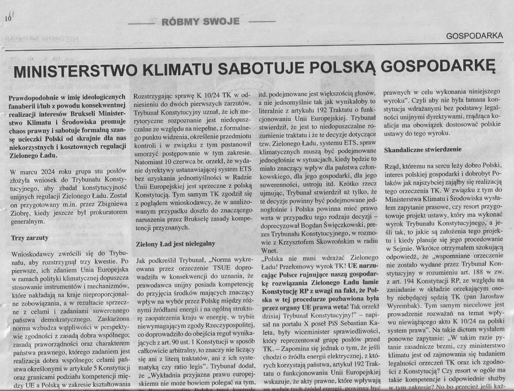 Prawdopodobnie w imię ideologicznych fanaberii i/lub z powodu konsekwentnej realizacji interesów Brukseli Ministerstwo Klimatu i Środowiska promuje chaos prawny i sabotuje formalną szansę ucieczki Polski od skrajnie dla nas niekorzystnych i kosztownych regulacji Zielonego Ładu. W gazecie regionalnej “Róbmy swoje” został opublikowany mój artykuł Ministerstwo klimatu sabotuje polską gospodarkę.