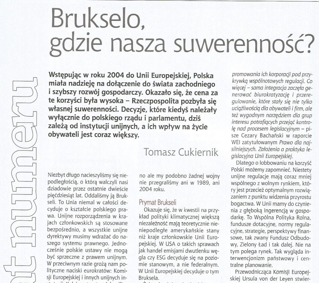 Wstępując w 2004 roku do Unii Europejskiej, Polska miała nadzieję na dołączenie do świata zachodniego i szybszy rozwój gospodarczy. Po latach okazało się, że cena za te korzyści była wysoka. Poza stratami finansowymi wynikającymi z unijnego prawodawstwa Polska pozbyła się także własnej suwerenności. Decyzje, które kiedyś należały wyłącznie do polskiego rządu i parlamentu, zależą od instytucji unijnych, a ich wpływ na życie obywateli jest coraz większy. W numerze 108 magazynu “Polonia Christiana” z 2026 roku został opublikowany jako temat numeru mój artykuł pt. Brukselo, gdzie nasza suwerenność?