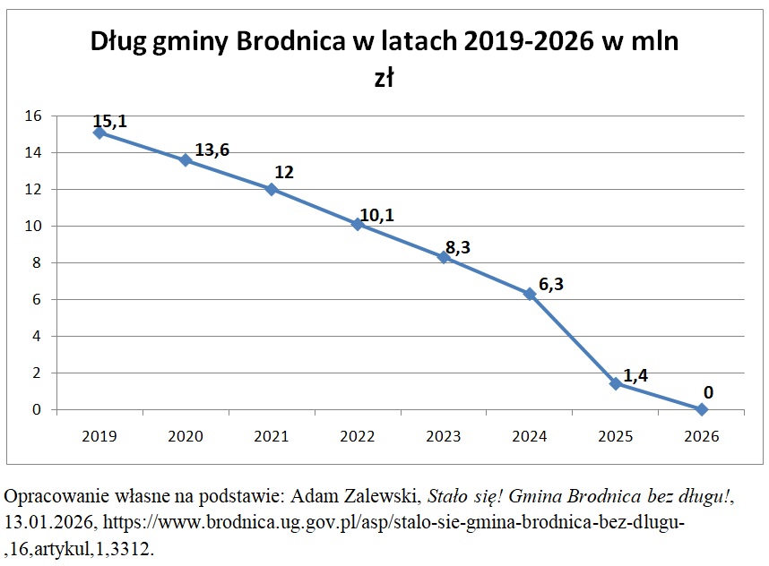 9-tysięczna gmina Brodnica (woj. kujawsko-pomorskie) jest dowodem na to, że jednostka finansów publicznych może funkcjonować bez zadłużania się, a nawet jeśli wyemituje obligacje, to jest w stanie wykupić je w planowanym terminie, bez rolowania długu, bez obciążania mieszkańców dodatkowymi zobowiązaniami finansowymi i bez specjalnego zaciągania pasa. W “Najwyższym Czasie!” nr 5-6 z 2026 roku został opublikowany, zaanonsowany na okładce, mój artykuł pt. Spłacili cały dług oraz wywiad z Adamem Zalewski, wójtem gminy Brodnica, Można żyć bez długu!