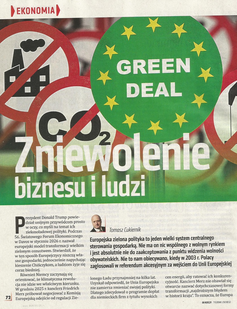 Europejska zielona polityka to jeden wielki system centralnego sterowania gospodarką. Nie ma on nic wspólnego z wolnym rynkiem i jest absolutnie nie do zaakceptowania z punktu widzenia wolności obywatelskich. Nie to nam obiecywano, kiedy w 2003 r. Polacy zagłosowali w referendum akcesyjnym za wejściem do Unii Europejskiej. W nr 12 z 2026 roku tygodnika "Do Rzeczy" został opublikowany mój artykuł pt. Zniewolenie biznesu i ludzi.