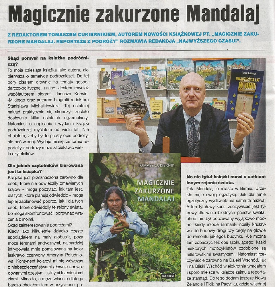"To moja dziesiąta książka jako autora, ale pierwsza o tematyce podróżniczej. Do tej pory pisałem głównie na tematy gospodarczo-polityczne, unijne. Jestem również współautorem biografii Janusza Korwin-Mikkego oraz autorem biografii redaktora Stanisława Michalkiewicza. Tej ostatniej nakład praktycznie się skończył, zostało dosłownie kilka ostatnich egzemplarzy. Natomiast o napisaniu i wydaniu książki podróżniczej myślałem od wielu lat. Nie chciałem, żeby był to prosty opis podróży, ale coś więcej. Wydaje mi się, że forma reportaży z podróży może zaciekawić wielu czytelników". W numerze 39-40 tygodnika “Najwyższy Czas!” z 2025 roku został opublikowany wywiad ze mną na temat moich podróży i najnowszej mojej książki pt. Magicznie zakurzone Mandalaj. Reportaże z podróży.